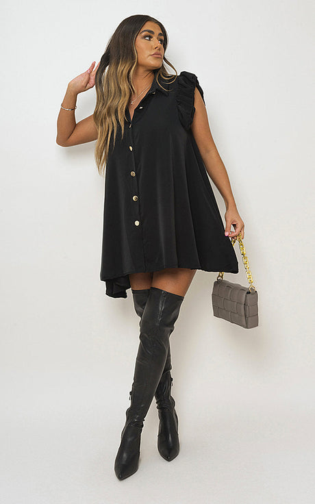 Gold Button Down Ruffle Sleeve Mini Dress