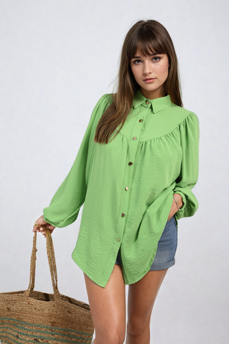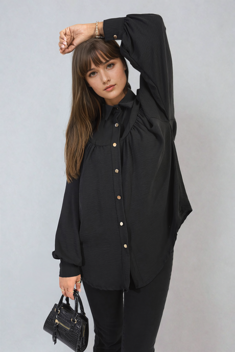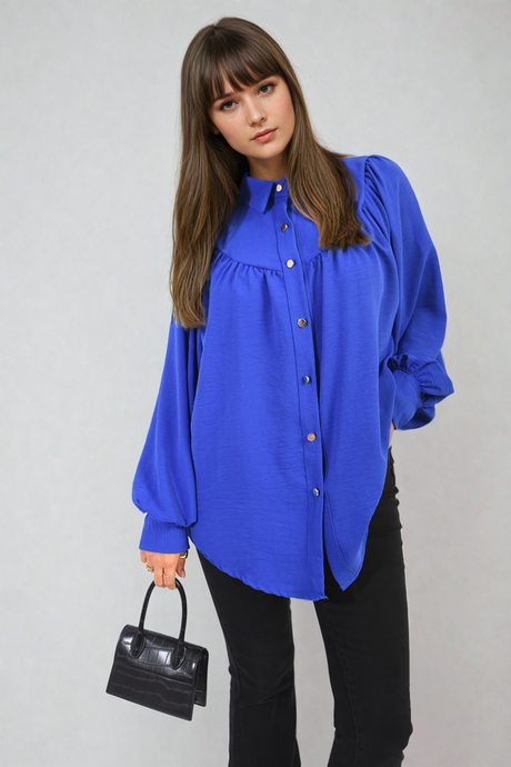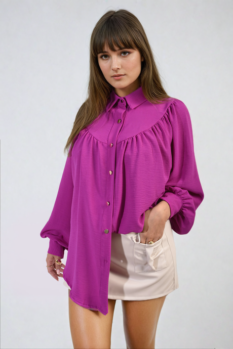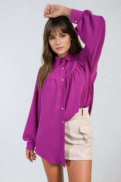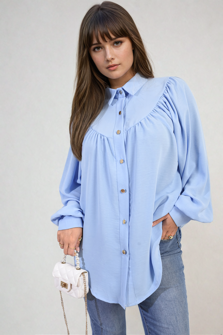 High Neckline Button Front Balloon Sleeve Top