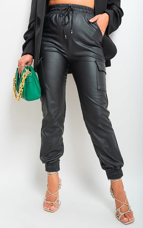 High Waisted Faux Leather Cargo Trousers