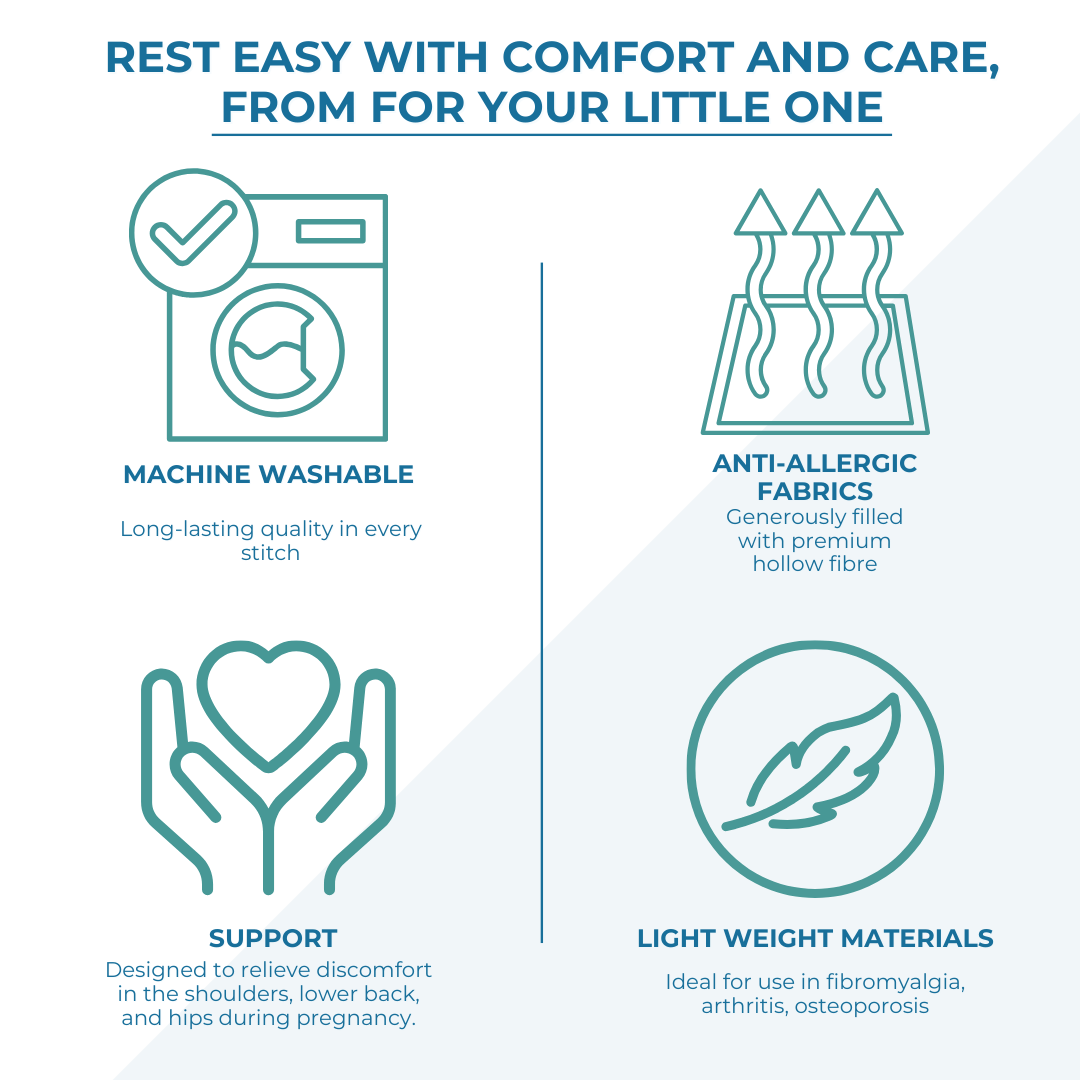 The soft light blue case adds a calming touch to your maternity essentials. Its breathable fabric keeps you cool and comfortable, while the high-quality filling ensures that the pillow retains its shape and supportive qualities for the long term.