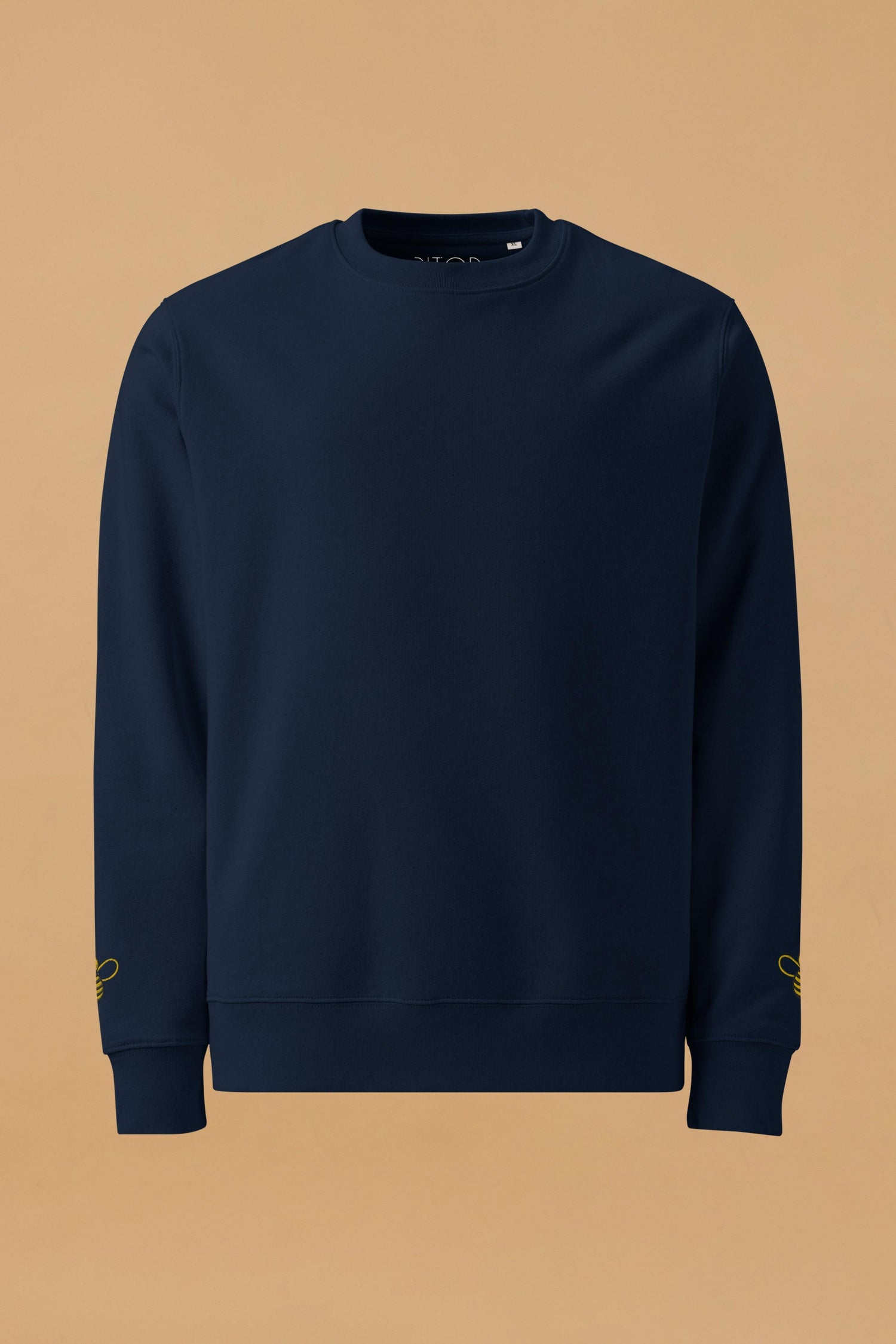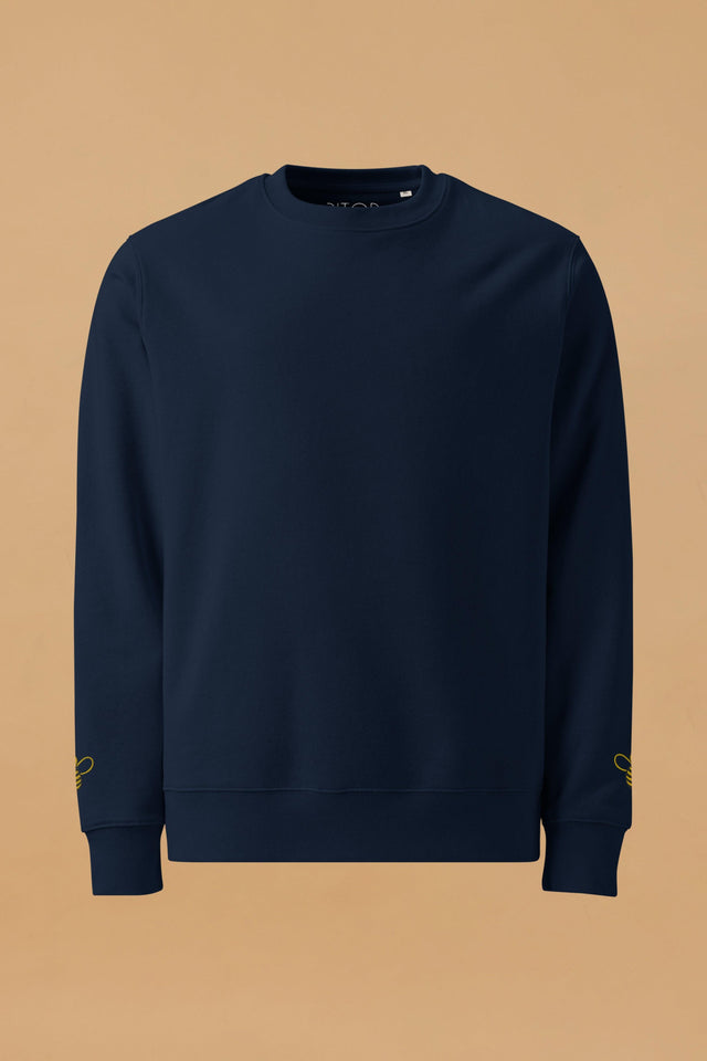 Introducing the Bee Sweatshirt—where simplicity meets sustainability. This unisex eco-friendly sweatshirt combines classic style with modern comfort, making it a versatile addition to any wardrobe. Crafted from 100% organic ring-spun combed cotton, the sweatshirt is not only durable but also exceptionally soft, providing a luxurious feel against your skin. The design is minimalistic yet eye-catching, featuring a single, delicately embroidered yellow bee on each sleeve. These small but striking details add a touch of playfulness and individuality to the otherwise clean and crisp look of the sweatshirt. With a fabric weight of 350 g/m² (10.3 oz./yd.²), this navy sweatshirt offers warmth without compromising on breathability, making it perfect for layering or wearing on its own. The Bee Sweatshirt is tailored for a regular fit, with set-in sleeves and 1×1 ribbing at the neck collar, sleeve hems, and bottom hem. The double-needle topstitching at the neck collar, sleeves, and bottom hems adds durability and a refined finish, while the inside herringbone back neck tape and self-fabric half-moon at the back neck ensure comfort and longevity. Whether you're dressing up or down, the Bee Sweatshirt offers a chic and comfortable option that stands out for its quality and eco-conscious design. Elevate your everyday look with this charming, sustainably made sweatshirt—perfect for any occasion.