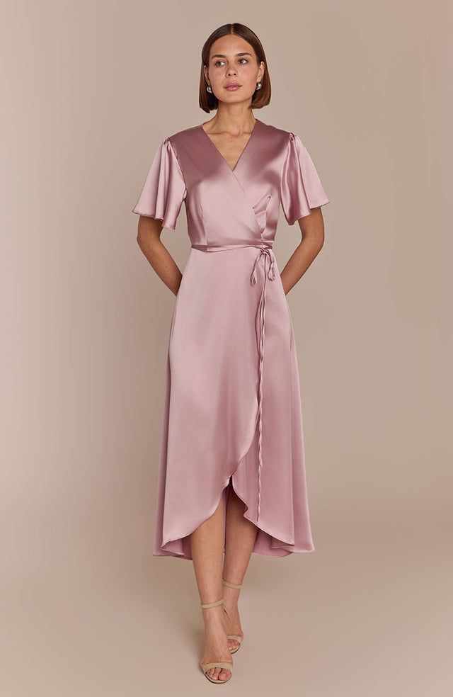 Soft and stylish, the Florence Waterfall Dress in Rose Pink is a dream if it's dusty pink bridesmaid dresses, light pink bridesmaid dresses, or pale pink bridesmaid dresses that you are after. This ankle-length wrap dress, with its waist tie and keyhole back, is not only perfect for sashaying down the aisle in but is also ideal for prom dresses, wedding guest gowns, or graduation dresses. Effortlessly chic for any occasion.