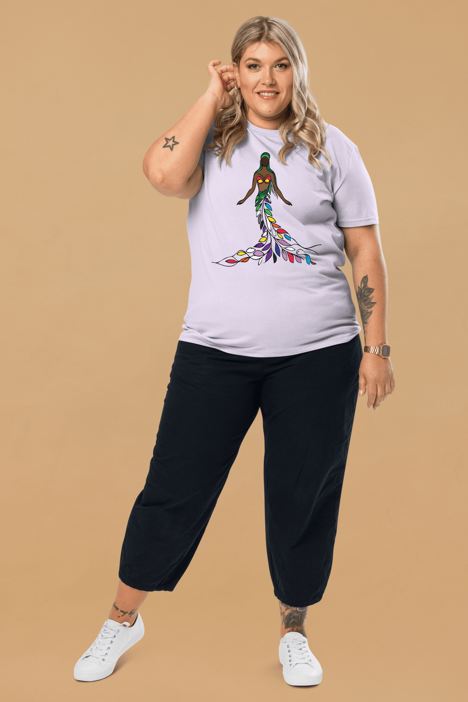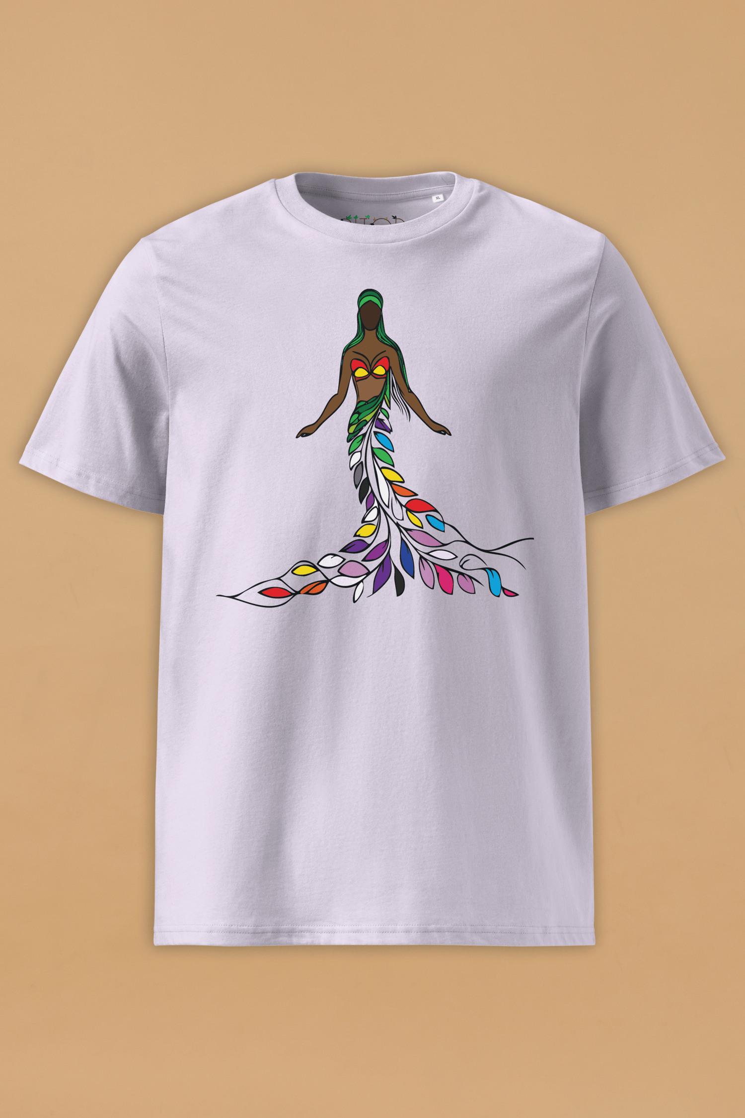 This stunning design features a figure of Mother Nature, rooted like a tree, with a flowing skirt made of leaves in the colours of different pride flags—rainbow, nonbinary, aromantic, lesbian, transgender, bisexual, gender-fluid, and pansexual. Just as the rainforest depends on every tree, river, and creature to maintain its balance, humanity thrives when every identity is embraced, respected, and protected.