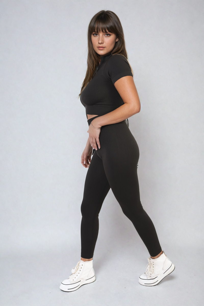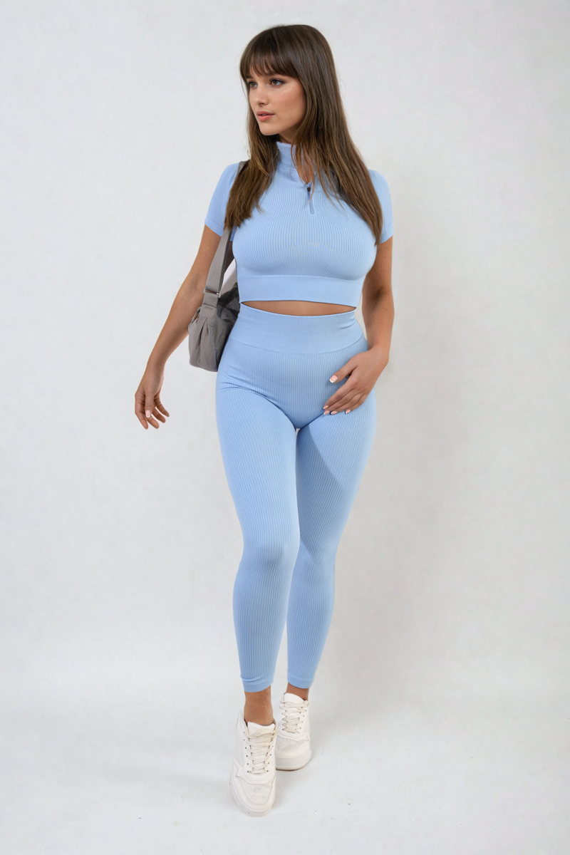 Elevate your athleisure game with the Ayah Ribbed Half Zip Crop Top and High Waist Leggings Co-ord Set. This chic set features a trendy ribbed design and a comfy high waist, perfect for both workouts and lounging. Stylish and comfortable, it's a must-have for your wardrobe.