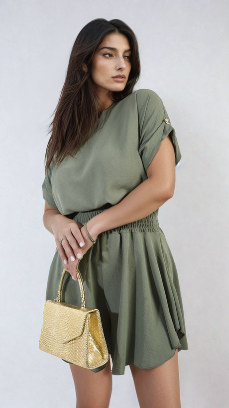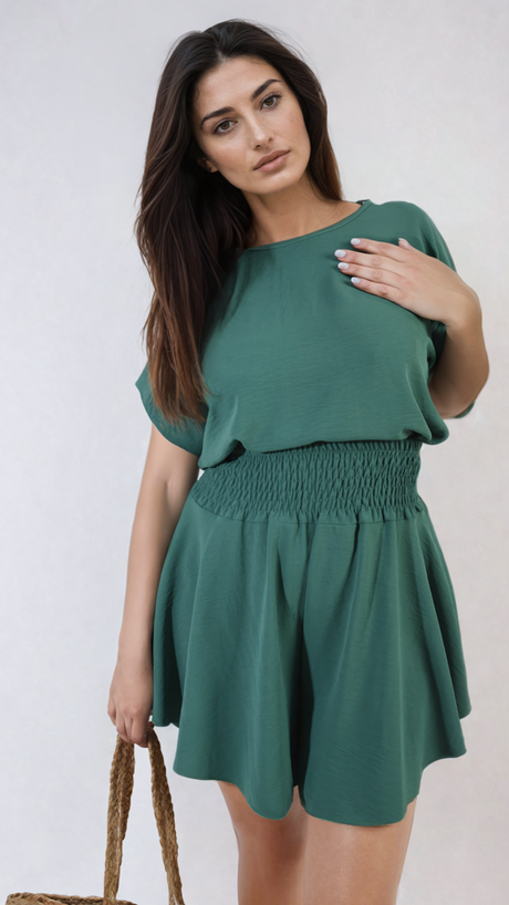 Roll Sleeve Top and Elastic Shirred Waistband and Shorts Co-ord Set