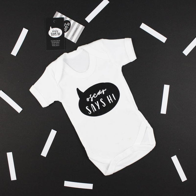 100% super soft white cotton t-shirt, printed with a black or gold hand-personalised 'Baby Says Hi' design, including with your baby's first name.