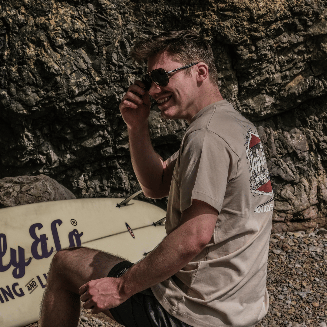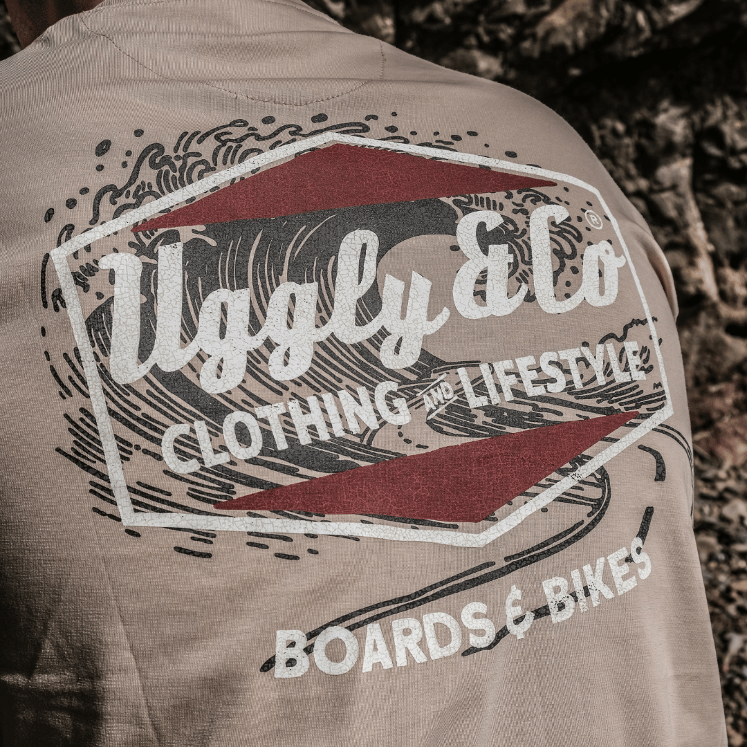 The Beige Surf Diamond Tee is a standout piece from our Collection 3.0 Boards & Bikes. Crafted from soft, premium fabric, this tee features the iconic Uggly&Co diamond logo front and center, set against a unique wave texture that runs through the background. Hand-sketched during the design process, the wave not only captures the essence of surfing but also features a winding road weaving into it, a subtle nod to our motorcycle roots.