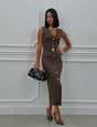Turn heads with our Black Bodycon Gold Button Belted Midi Dress, a timeless statement piece designed for elegance and sophistication. Crafted in a figure-hugging pencil silhouette, this sleeveless dress features luxe gold statement buttons, a waist-cinching belt with gold buckle, and a front slit that adds just the right touch of allure.