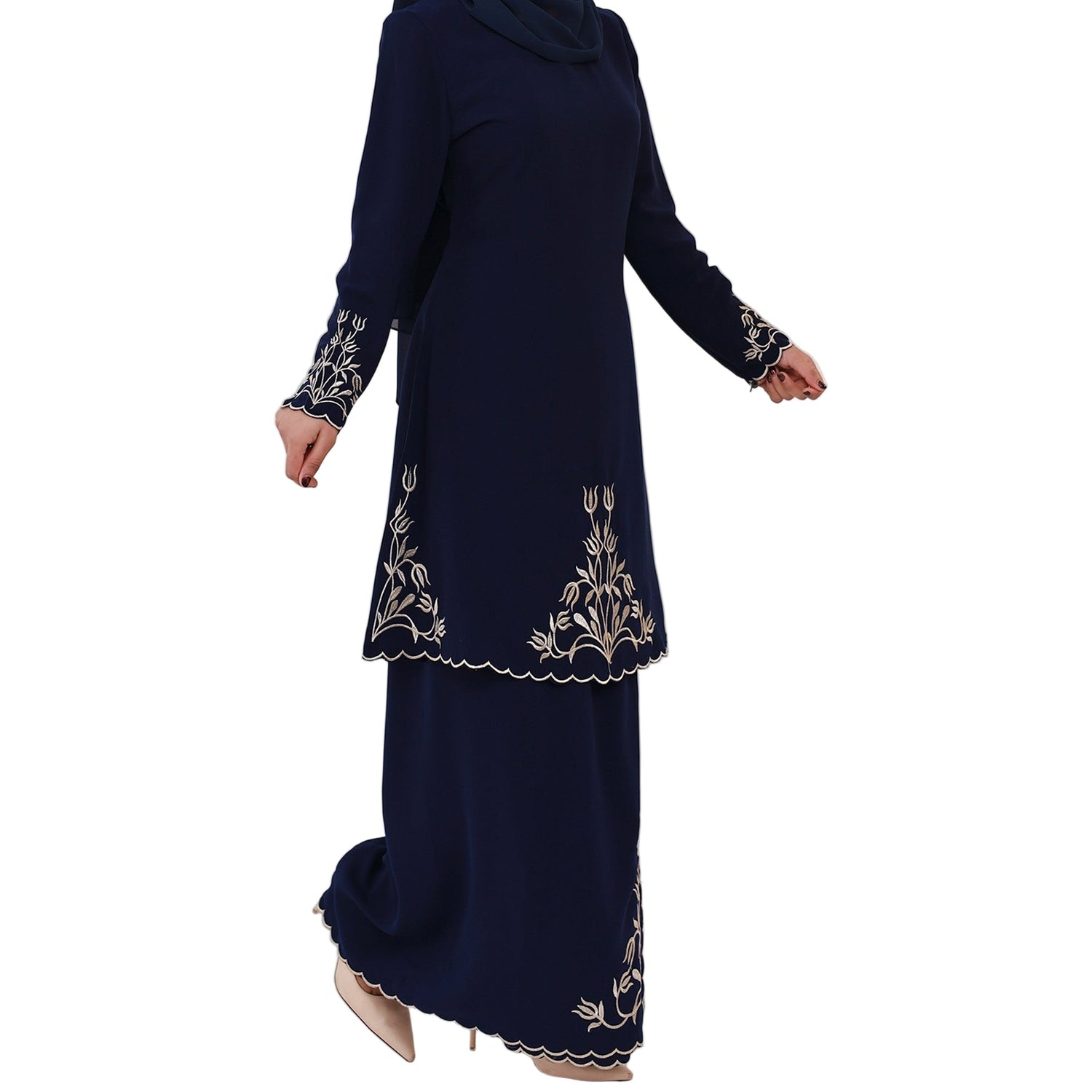 This Malay Middle East Exquisite Embroidery Suit for women blends traditional craftsmanship with elegant design. The detailed embroidery highlights timeless cultural artistry, while the tailored fit ensures comfort and sophistication. Perfect for formal occasions, this suit offers a refined look that honors heritage with a contemporary touch.