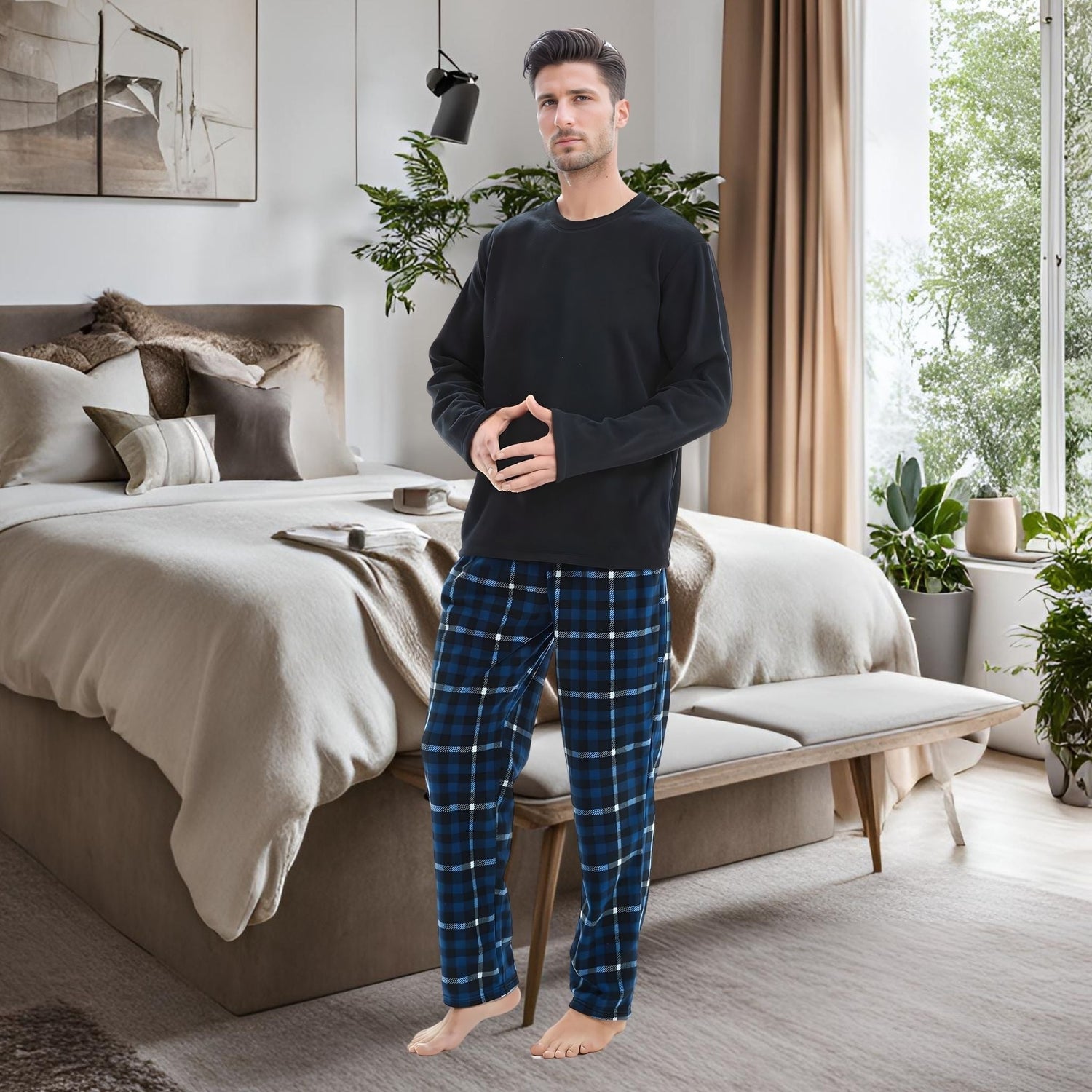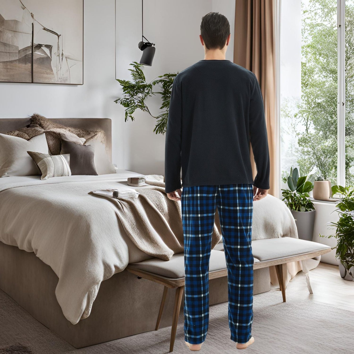 Mens Navy Check Thermal Fleece Pyjama Set with Luxury Design - Navy Blue / M / United Kingdom is backordered and will ship as soon as it is back in stock.