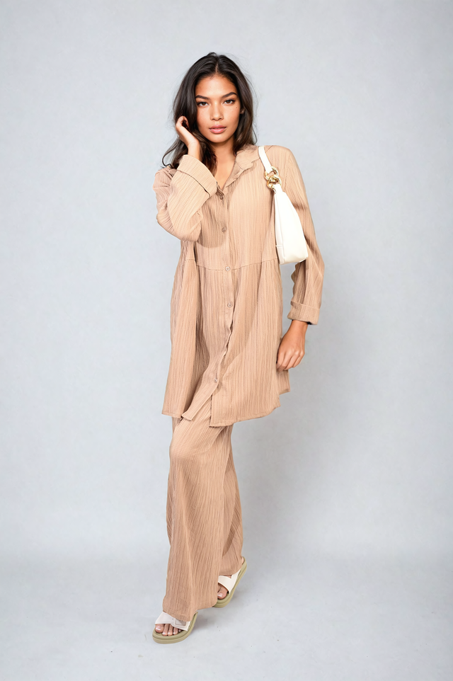 Oversized Collared Button Down Long Sleeve Top and Trouser Co-ord Set - Beige / ONE SIZE (8-16) is backordered and will ship as soon as it is back in stock.