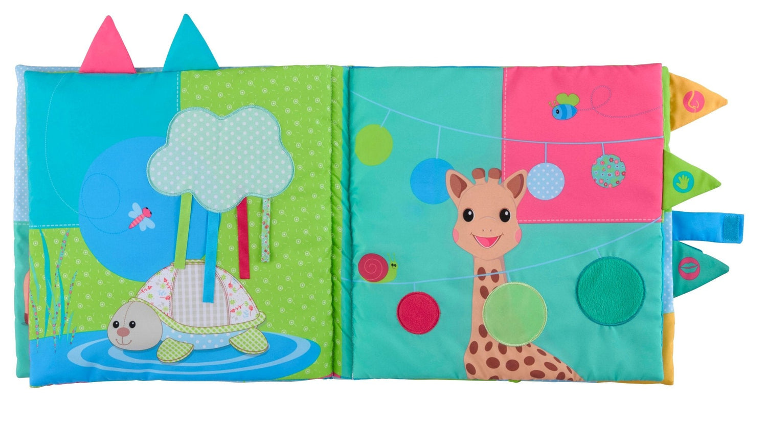 Large fabric book, offering baby various discoveries to amuse and stimulate him. Hearing, sight and touch are stimulated on each page with a ring to chew on to relieve teeth!
