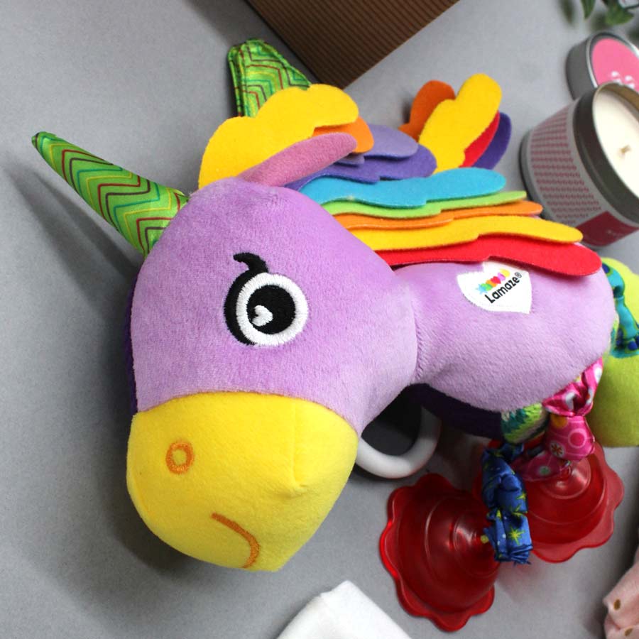 Lamaze Sensory Unicorn- a soft and cute toy Tilly Tiddlewinks is great for entertaining babies on the go or at home. Features contrasting bright colours, textures and prints to stimulate baby's senses.