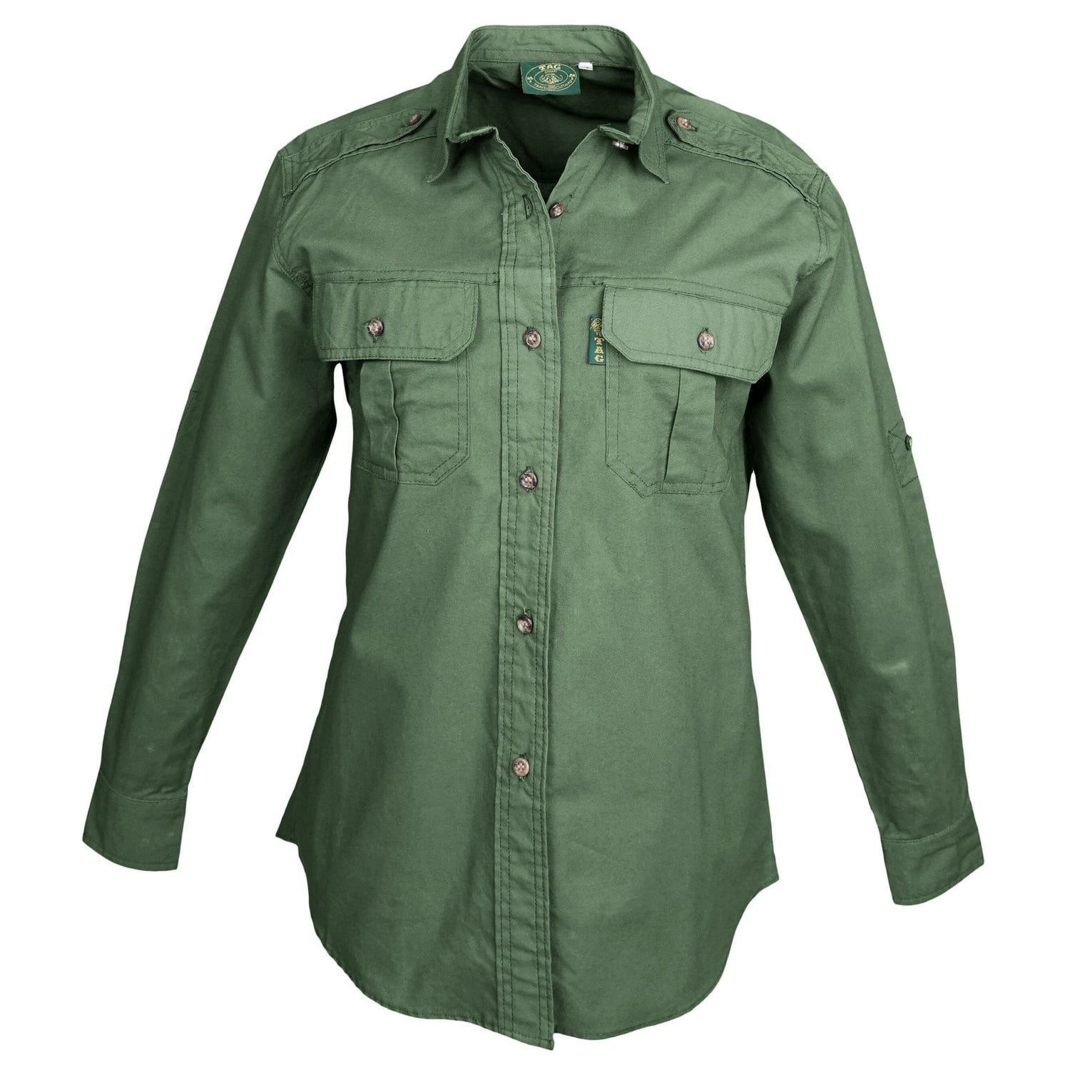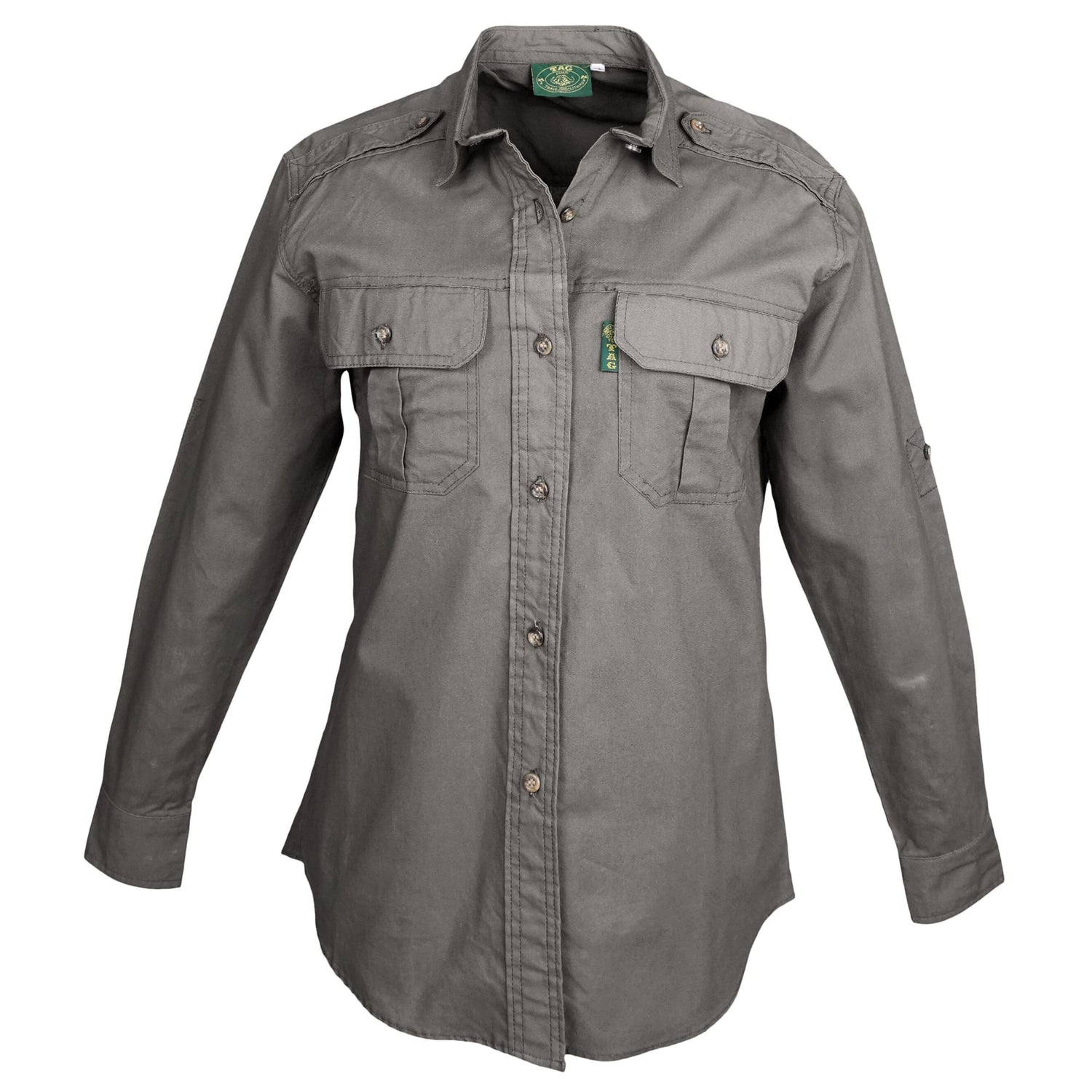 - PRACTICAL FEATURES: Tag Safari long Sleeve women's shirt with two chest pockets with button down flaps for convenient storage of essential outdoor gear, functional cross-stitched epaulettes prevent a camera or canteen from slipping off your shoulder.