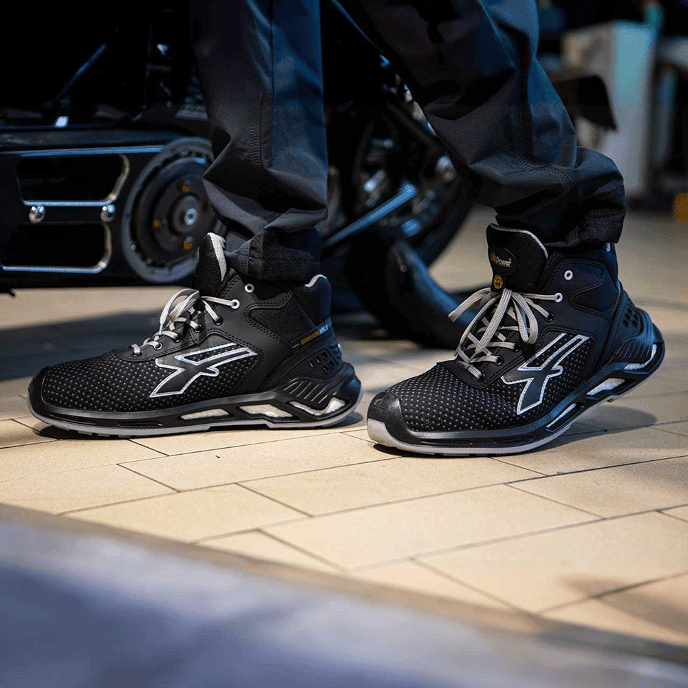 Safety shoes high, light and comfortable U-Power of the Red 360. High abrasion resistant PUTEK® star upper, water repellent, breathable, heel shock shield, aluminum toecap, anti-puncture, anti-slip and PU / PU infinergy, S3 SRC CI ESD sole