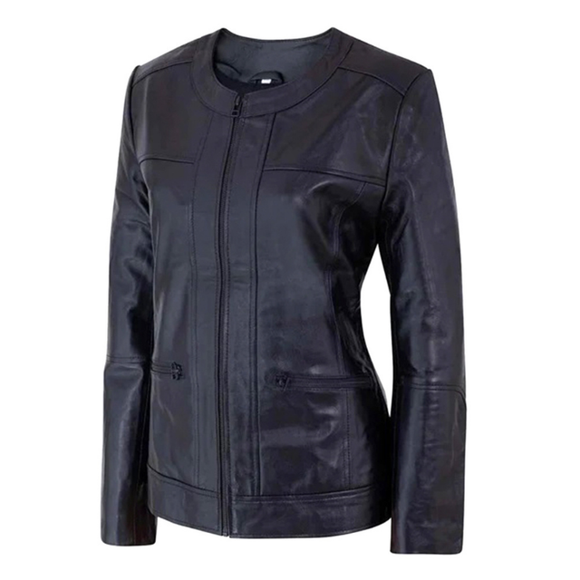 Women's Café Racer Zip-Front Leather Jacket, Collarless Design | Black