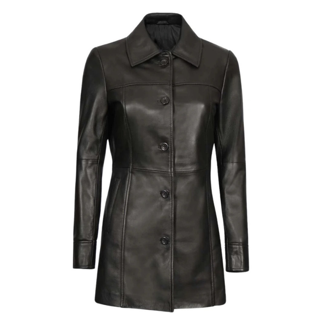 Elevate your style with this stunning women's 3/4 length genuine leather coat. Crafted from premium quality leather, this coat exudes sophistication and timeless elegance. The sleek black hue adds a touch of mystery and versatility, allowing you to effortlessly transition from day to night. The tailored silhouette and button-front design create a flattering fit, while the collar and front pockets lend a polished look. Whether you're dressing up for a night out or adding a touch of luxury to your everyday ensemble, this leather coat is a wardrobe essential. Embrace the perfect blend of fashion and functionality with this investment piece that promises lasting quality and style.
