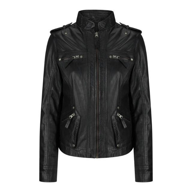 Make a bold statement with this classic black leather motorcycle jacket that perfectly balances style and edge. The stand-up collar adds a touch of sophistication while protecting against wind, and multiple zip pockets offer both aesthetic appeal and practical storage. The jacket features shoulder epaulettes, adding military-inspired detail to its timeless design. Crafted with meticulous attention to detail, this fitted jacket includes convenient zippered pockets at the chest and waist, plus a full-length front zipper for easy wear. The structured silhouette creates a flattering fit while maintaining mobility. Perfect for casual outings or adding attitude to dressier ensembles, this versatile piece works well with everything from jeans to dresses. The durable construction ensures this jacket will be a wardrobe staple for years to come. For best results, follow leather care instructions to maintain the jacket's premium look and feel.